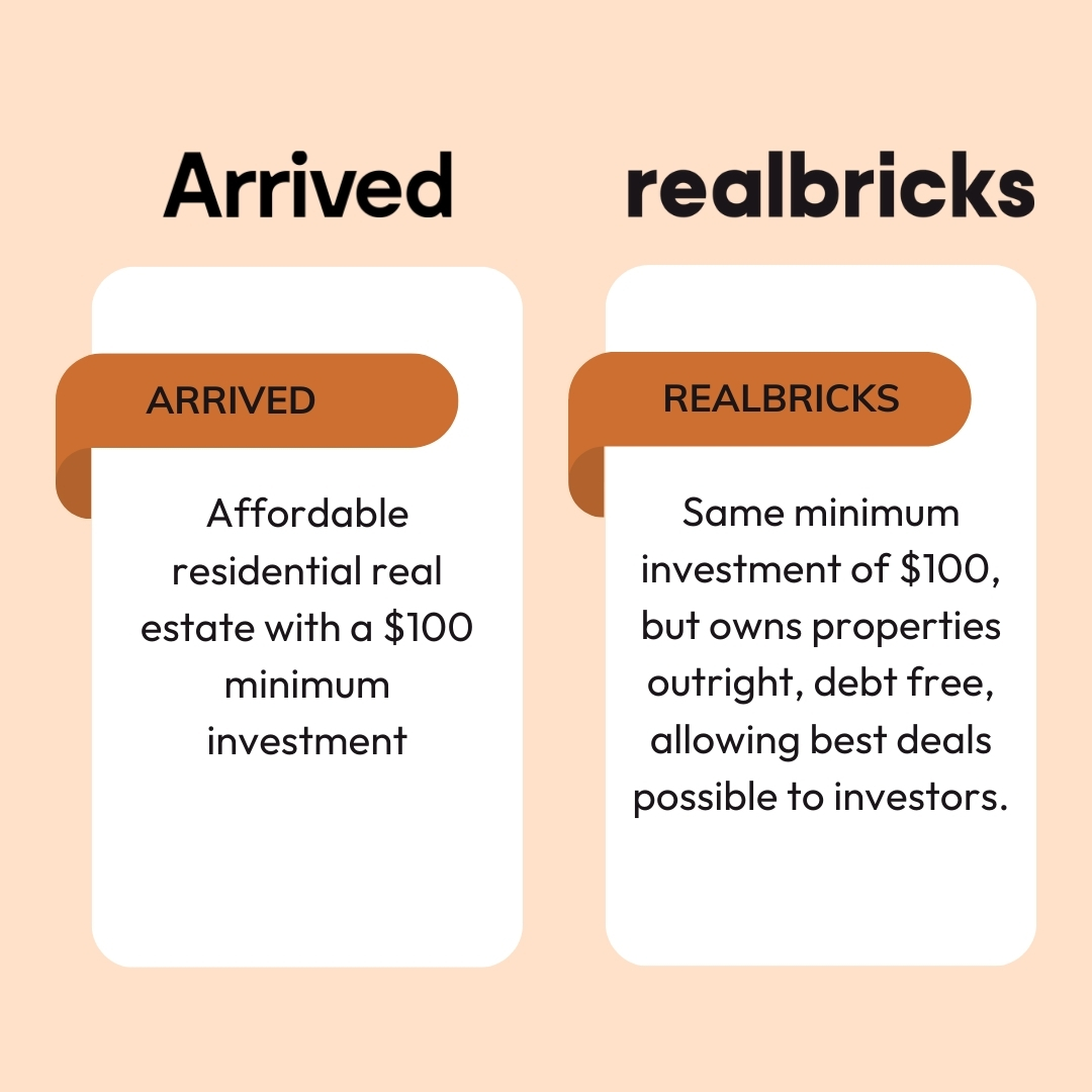 Both Arrived and Realbricks offer relatively low barriers to entry, making them accessible to a broad range of investors. Arrived allows users to start investing with as little as $100, which opens up real estate opportunities to those who may not have large amounts of capital to commit. Similarly, Realbricks offers the same minimum investment amount of $100, allowing for easy access to its debt-free real estate portfolio.