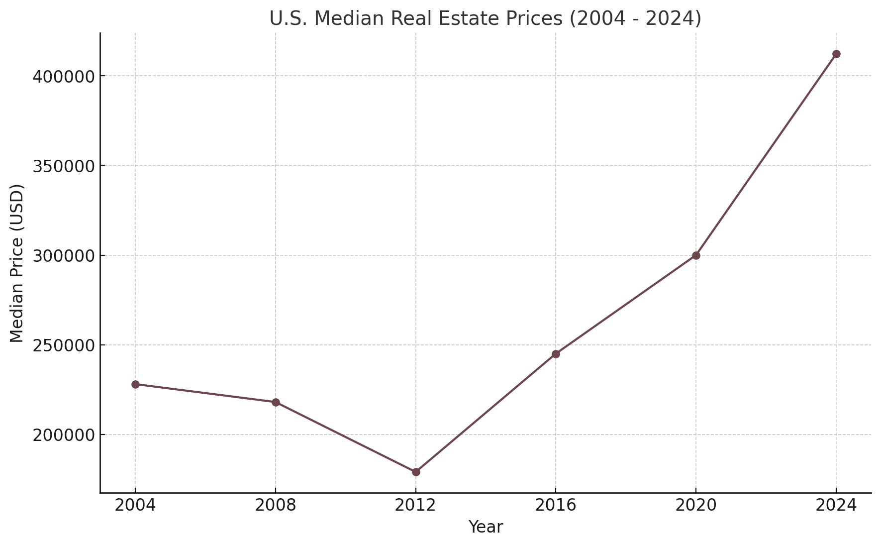 Real estate investing is widely considered a good investment due to its potential for long-term appreciation, steady cash flow through rental income, and its role as a hedge against inflation. The chart below demonstrates this point clearly: despite the housing market downturn between 2006 and 2012, real estate prices rebounded strongly and have grown consistently ever since. By 2024, the median real estate price has more than doubled from its low point in 2012, reaching over $400,000. This long-term appreciation shows that real estate, even after experiencing market volatility, can deliver substantial returns over time. Additionally, investing in real estate can offer cash flow through rent and build equity, making it a compelling choice for investors seeking stable growth and income. The upward trend shown in the chart illustrates how patient investors in real estate benefit from market recoveries and long-term value growth.