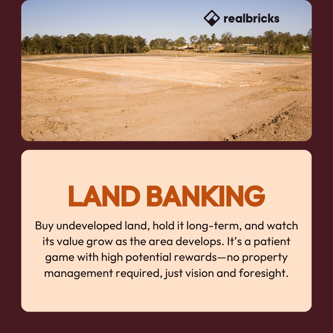 Land banking involves purchasing undeveloped land in areas that are likely to experience future growth and development. Investors hold the land long-term, waiting for it to appreciate in value as nearby areas develop. This strategy requires patience, as returns are not immediate, but it can be highly profitable if the land is located in a high-growth area. Time commitment is low since there’s no property management involved, but the capital requirements can be substantial depending on the size and location of the land.
