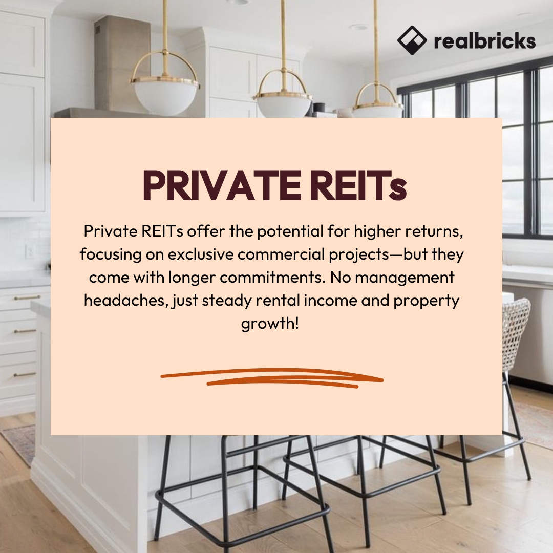 Private REITs (Real Estate Investment Trusts) are similar to public REITs but are not traded on stock exchanges. They are available only to accredited investors and tend to focus on large-scale commercial properties or development projects. Private REITs offer higher returns than public REITs due to their exclusivity and risk profile, but they are less liquid and often require longer holding periods. Investors benefit from rental income and property appreciation without direct management responsibilities.