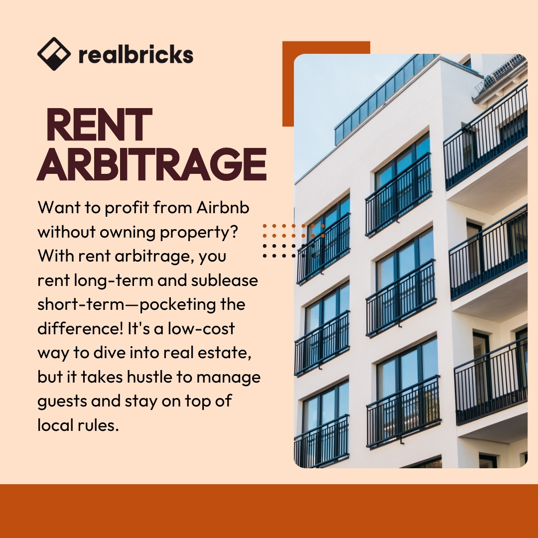 Rent arbitrage involves renting a property from a landlord and then subleasing it on a short-term basis through platforms like Airbnb. The investor profits by charging more for the short-term rental than they pay in long-term rent to the landlord. This strategy allows investors to enter the short-term rental market without owning property, making it a low-capital investment. However, it requires significant time to manage guest turnover and maintain the property, as well as navigating local regulations around short-term rentals.
