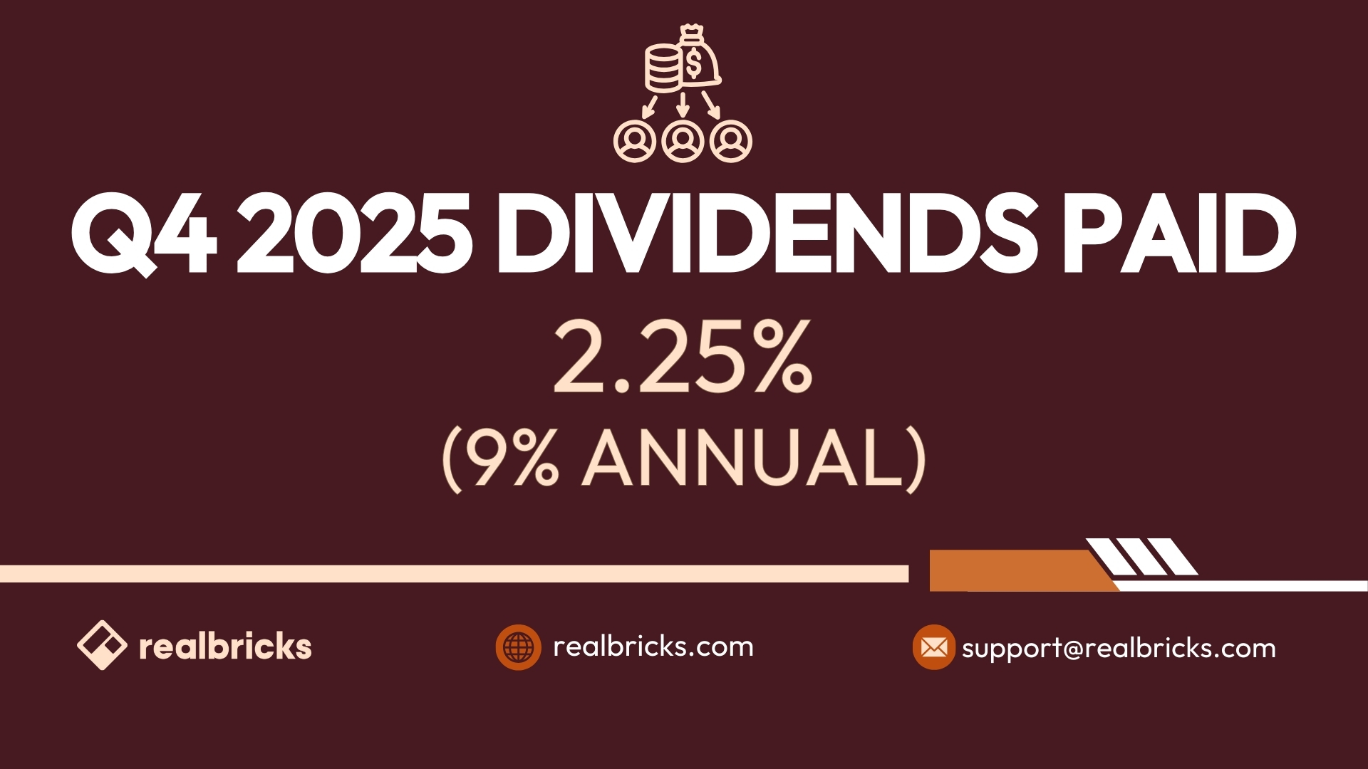 Realbricks announces a 2.25% Q4 2024 dividend payout with a 9% annual yield. See how investors benefit from fractional real estate investing today.